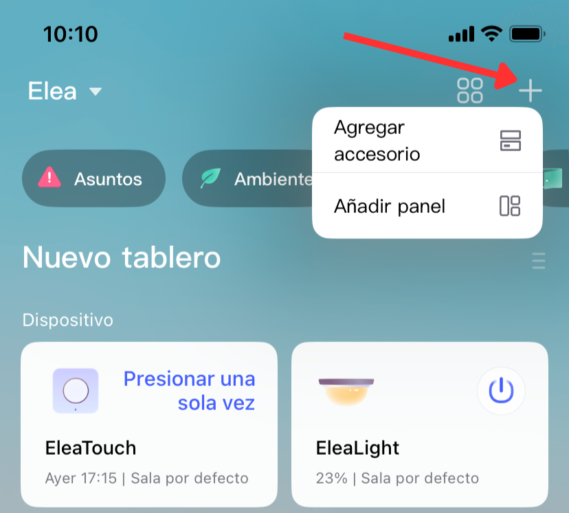 After registering in the app, you need to add devices by tapping here and selecting "Agregar accesorio":