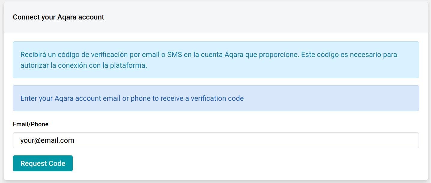 Now on the EleaAlert platform, add an Aqara provider device. If this is your first time, you'll need to specify the email you used for your Aqara app account: