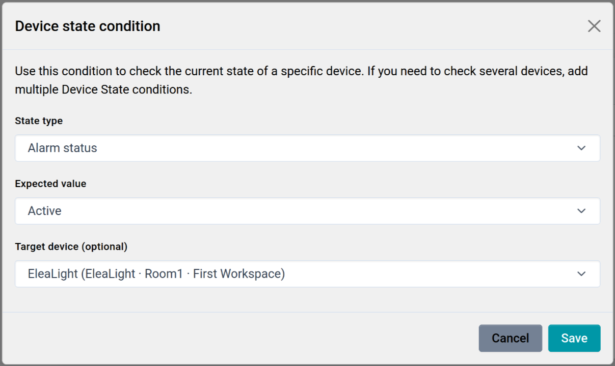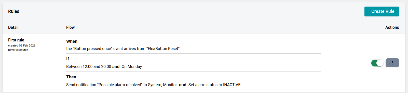 Cuando se presiona el botón EleaTouch, cambie el estado de Alarma en el sistema para ese mismo botón o para cualquier otro dispositivo, y muestre su mensaje de Alarma en la plataforma Elea Alarm.