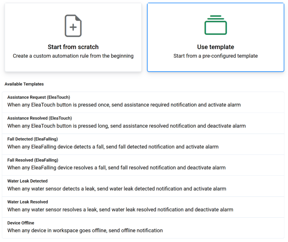 Si elige crear una regla desde cero, será llevado a la página de selección de disparador. Un disparador es lo que inicia la ejecución de la regla, haciendo que todo el proceso sea automático. Puede elegir entre un evento que proviene de un dispositivo o un momento específico cuando la regla debería ejecutarse.
