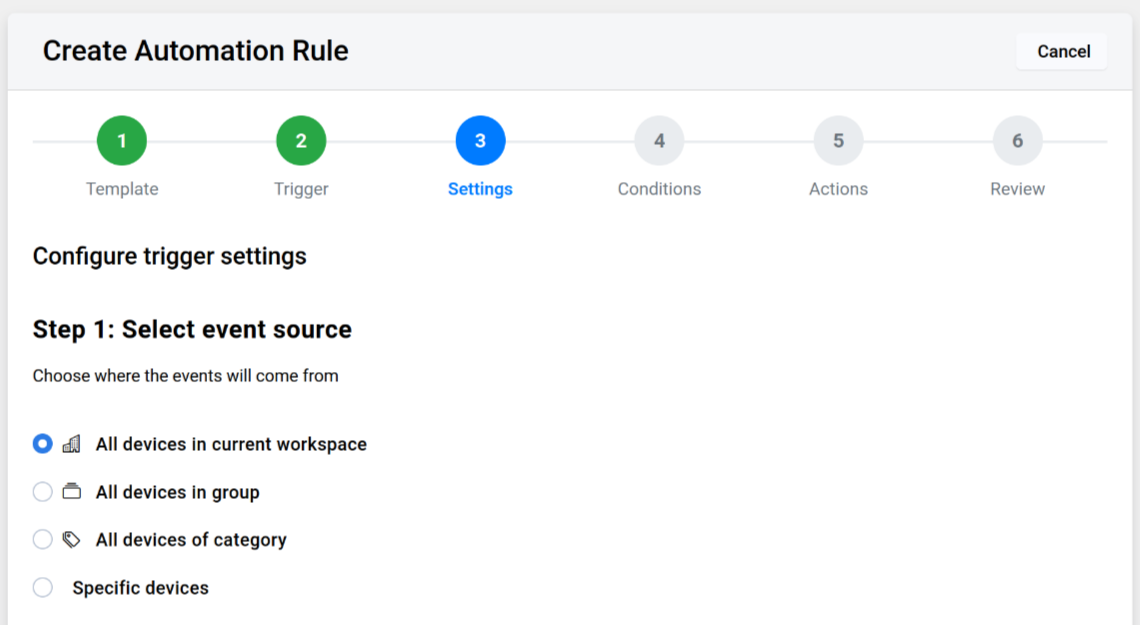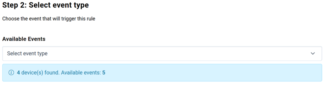 El segundo paso es seleccionar el evento que se aplica a todos los dispositivos elegidos. Solo verá los eventos comunes a los dispositivos seleccionados.