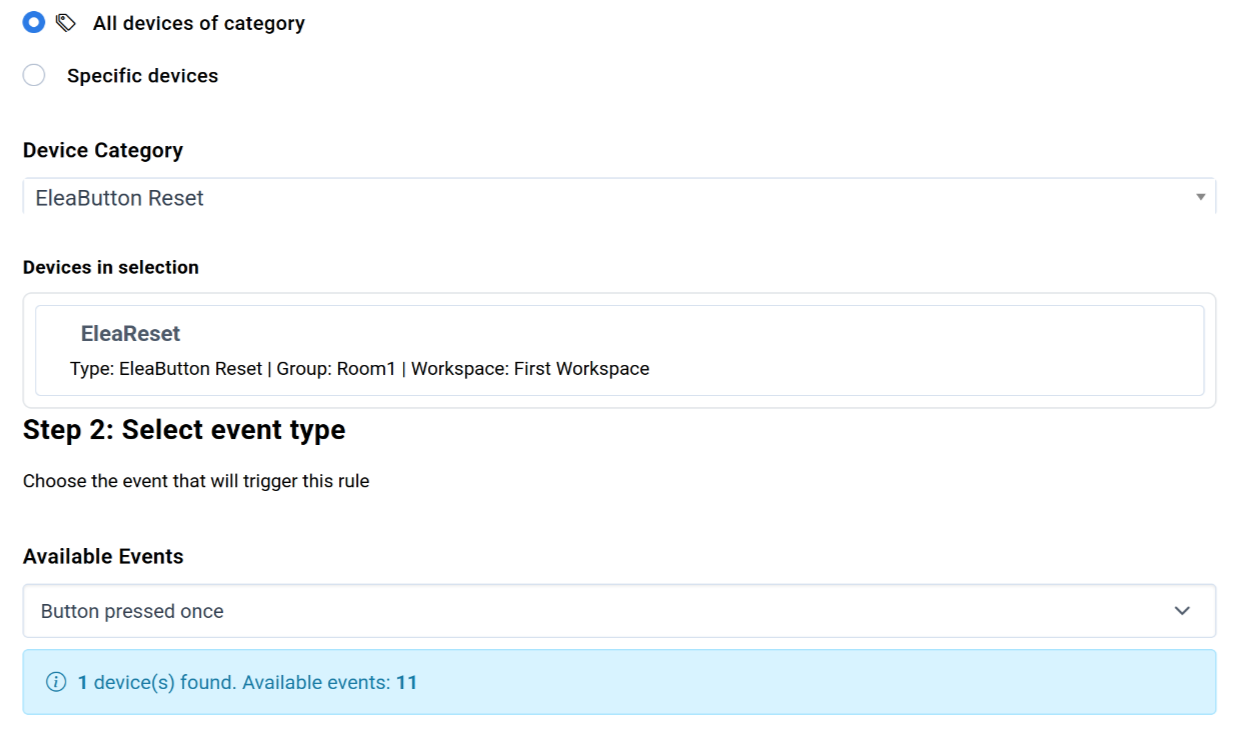 Por ejemplo, seleccionemos todos los dispositivos en la categoría EleaButton Reset. Vemos que solo hay un dispositivo disponible. Seleccionamos el evento Botón presionado una vez y hacemos clic en Siguiente.